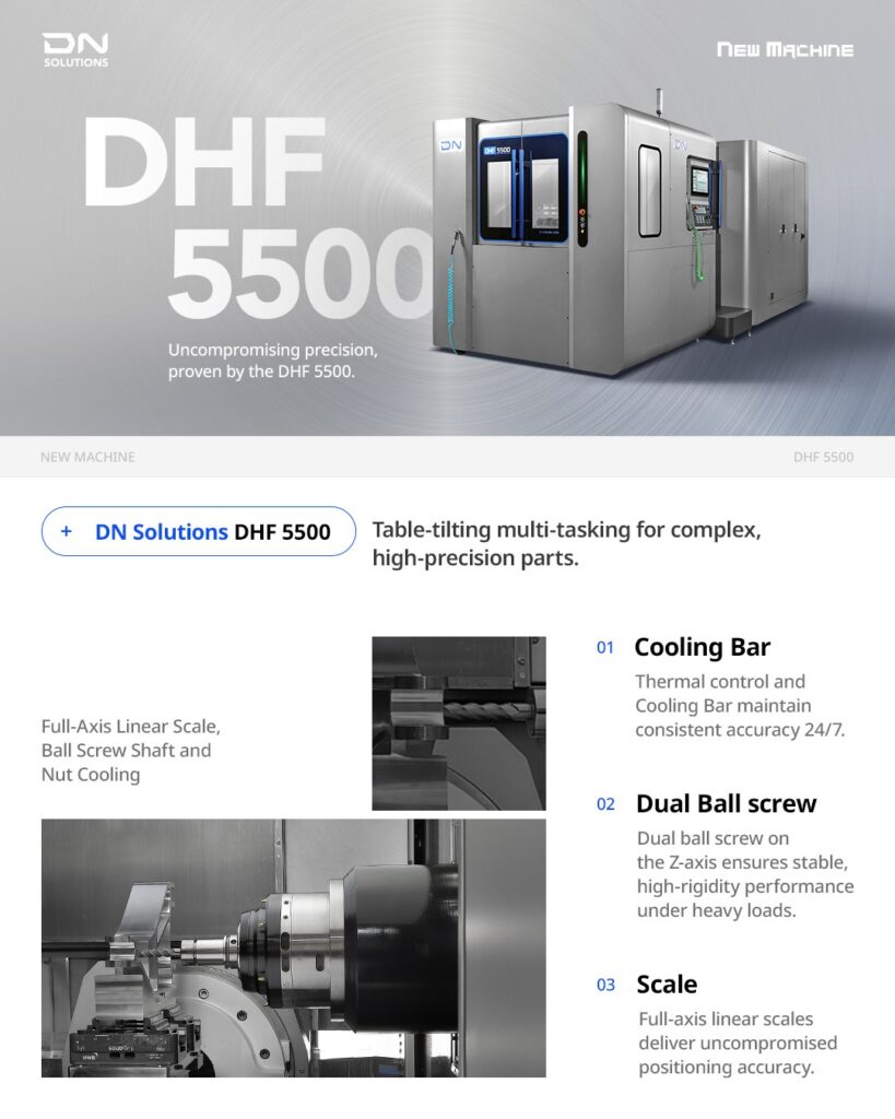 DN Solutions (DNS) tiếp tục khẳng định năng lực công nghệ khi chính thức ra mắt dòng máy DHF 5500 – giải pháp được thiết kế dành riêng cho các bài toán gia công phức tạp, yêu cầu độ chính xác cao và độ ổn định lâu dài trong sản xuất công nghiệp hiện đại.